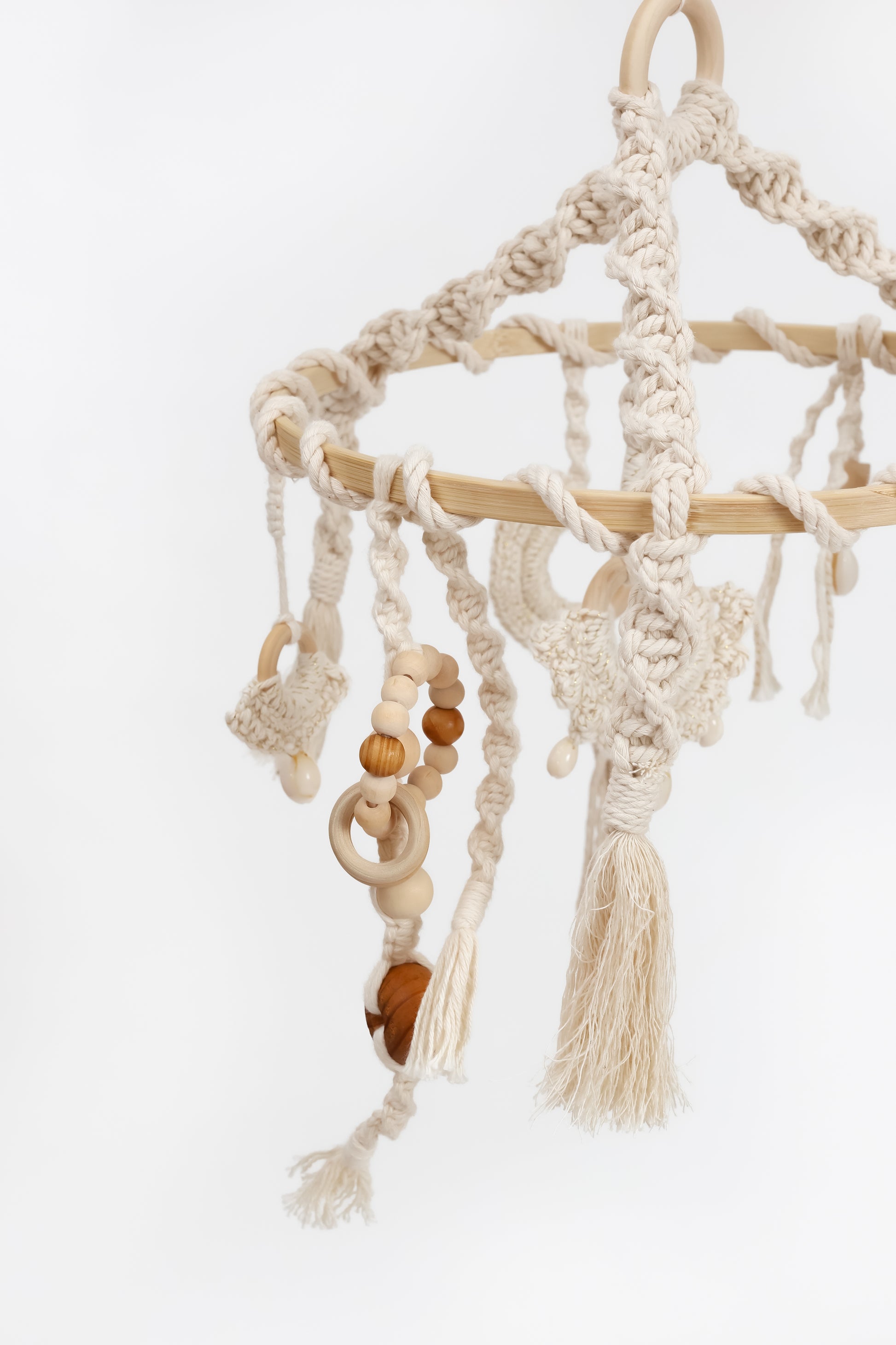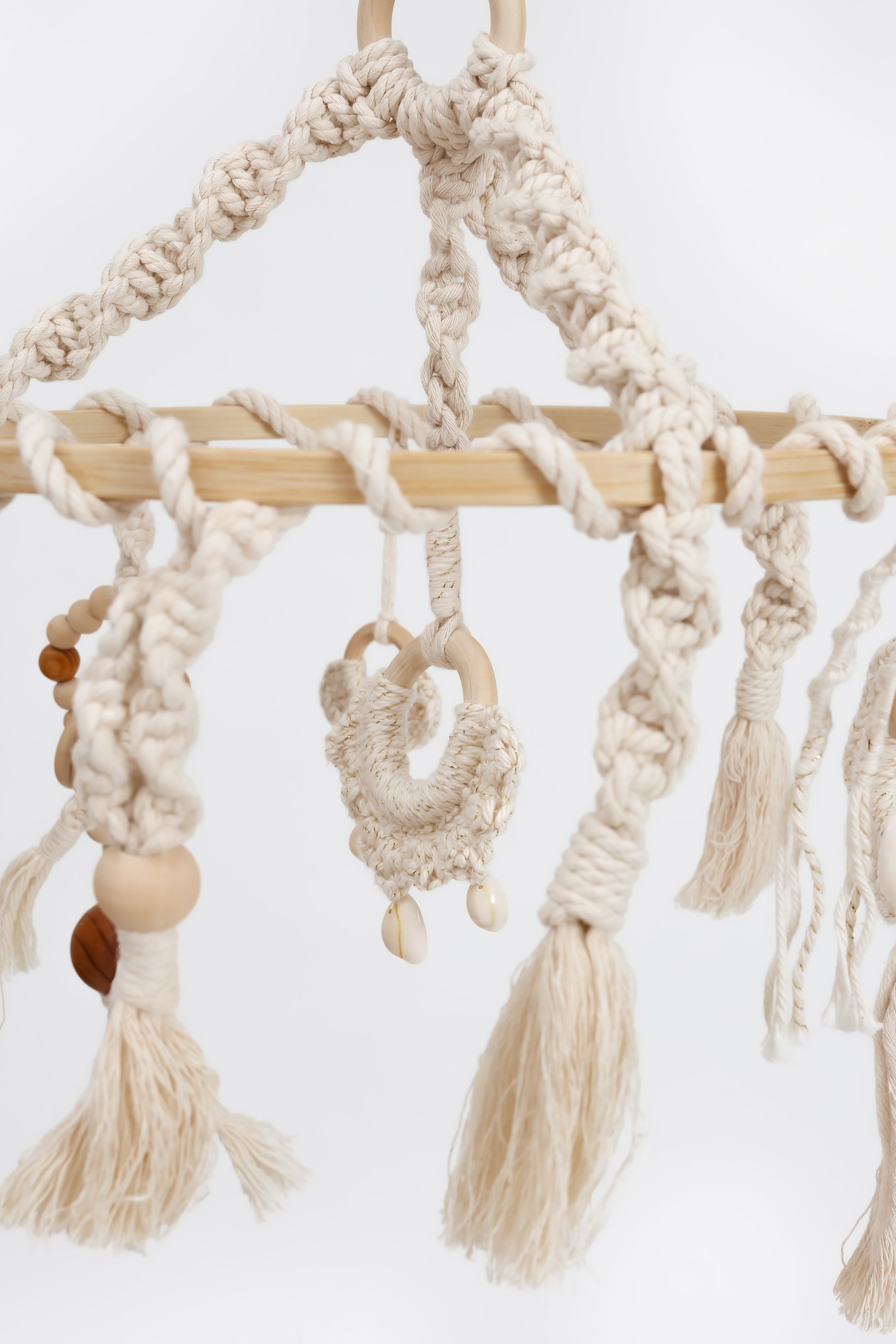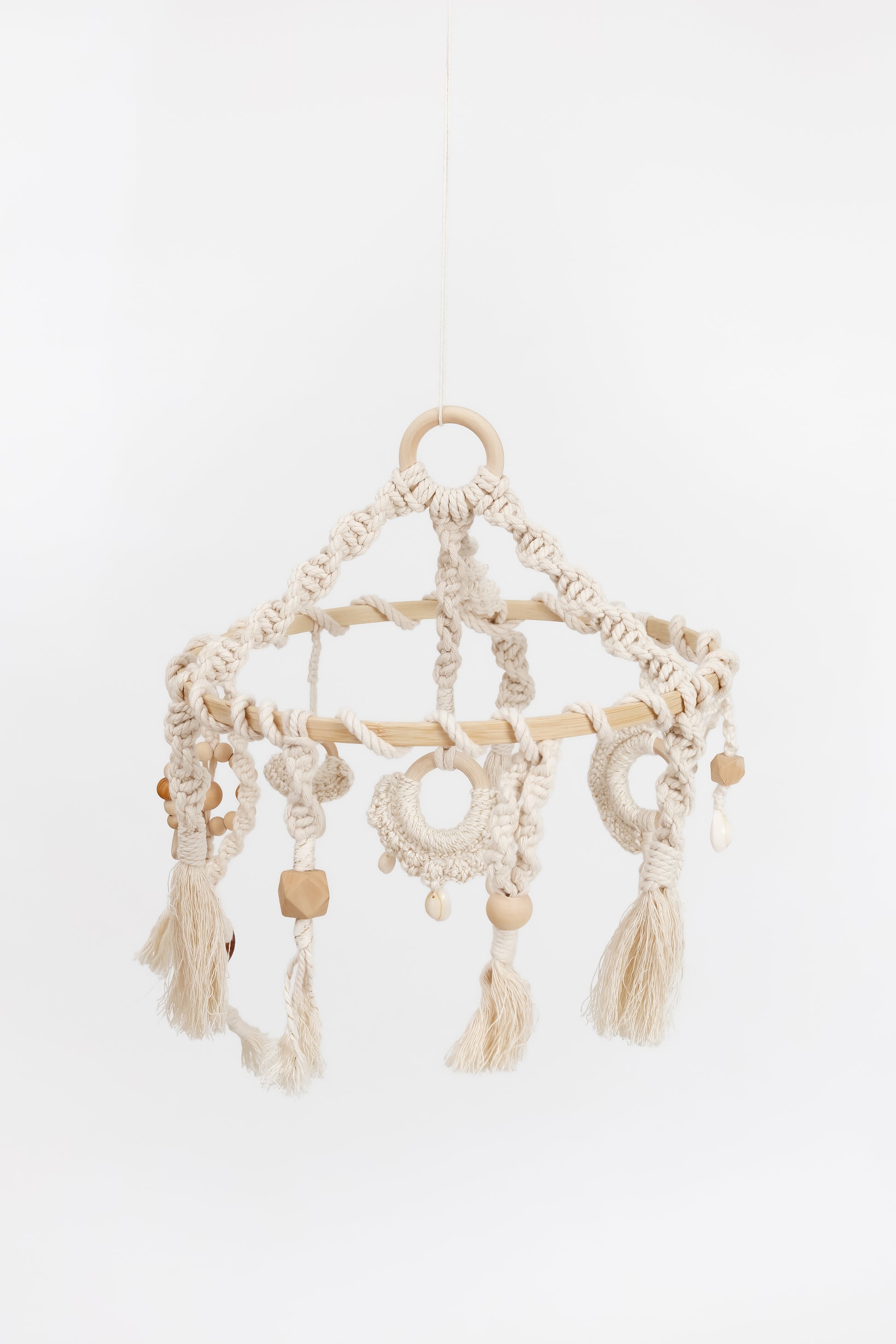 Este delicado móvil de macramé es el resultado de una colaboración entre M de María y la marca artesanal Raíces de Mar. Tejido a mano con materiales nobles y pequeños detalles, es una pieza que aporta suavidad, armonía y detalle a los espacios infantiles.
